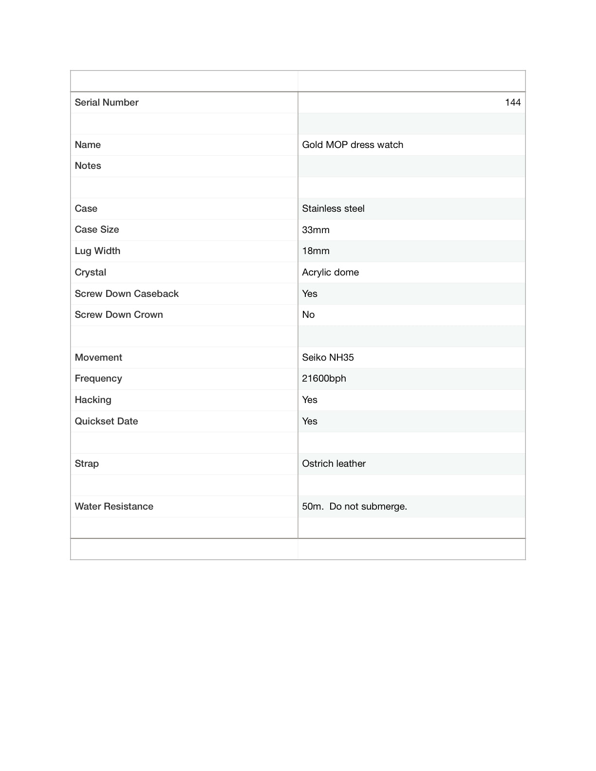 33mm Golden mother of pearl dress watch. Ostrich leather strap.