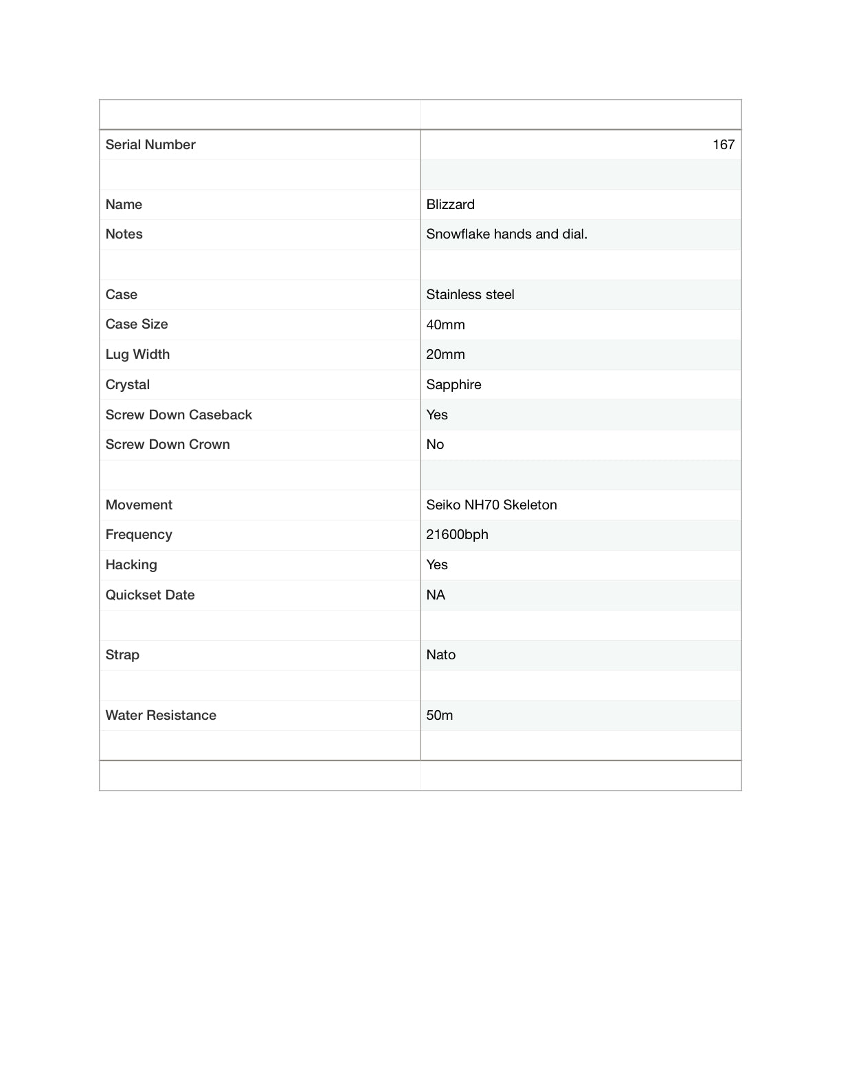 Blizzard - 40mm Stainless steel case. Sapphire crystal. Snowflake dial and handset. Seiko NH70 skeleton automatic.