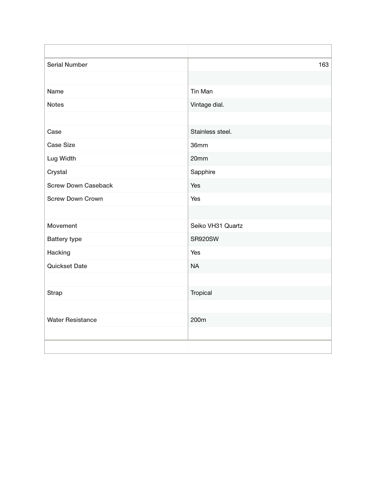 Tin Man. Unique vintage dial. 36mm stainless steel case. Sapphire crystal. VH31 quartz movement with sweeping seconds hand.