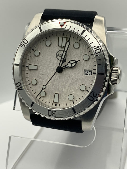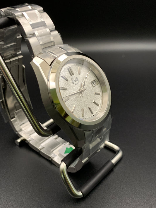 39mm Metallic shades of silver dress watch. Textured dial. Bracelet