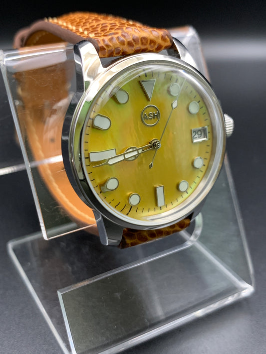 33mm Golden mother of pearl dress watch. Ostrich leather strap.